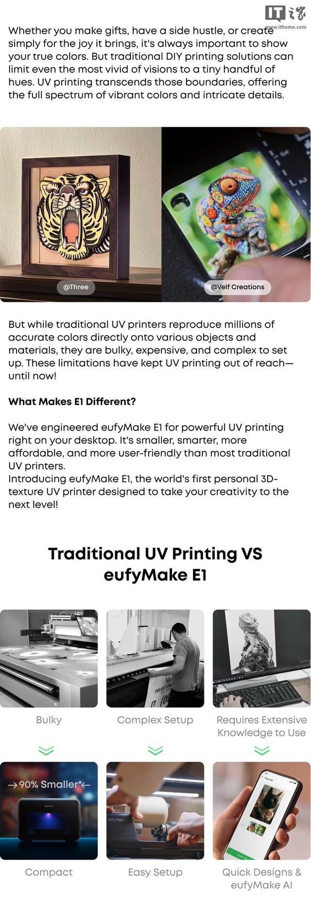 根据官方描述,该打印机可在金属、玻璃、亚克力、木质表面印刷,可模拟油画笔触、皮革压纹等质感,印刷高度可达 5mm;同时该打印机随附的应用程序中还带有 AI 创作功能,可供用户生成纹理、浮雕等效果。